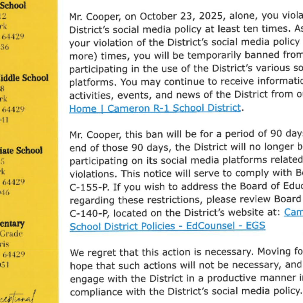 Andi Lockridge, as president of the Cameron R-1 Board of Education, you have the power to change this today. You don’t need to wait for the legislature. You took an oath to uphold the Constitution—including the First Amendment.