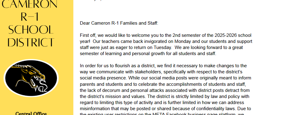 On February 18, 2026, the Cameron Citizen-Observer published a response from Cameron R-1 Superintendent Dr. Matt Robinson addressing concerns I have raised about the district. The article was titled “Robinson Responds to Flurry of Gilbert’s Attacks.” In it, Robinson addressed four numbered issues. He closed by announcing he will not be responding to every letter to the editor.